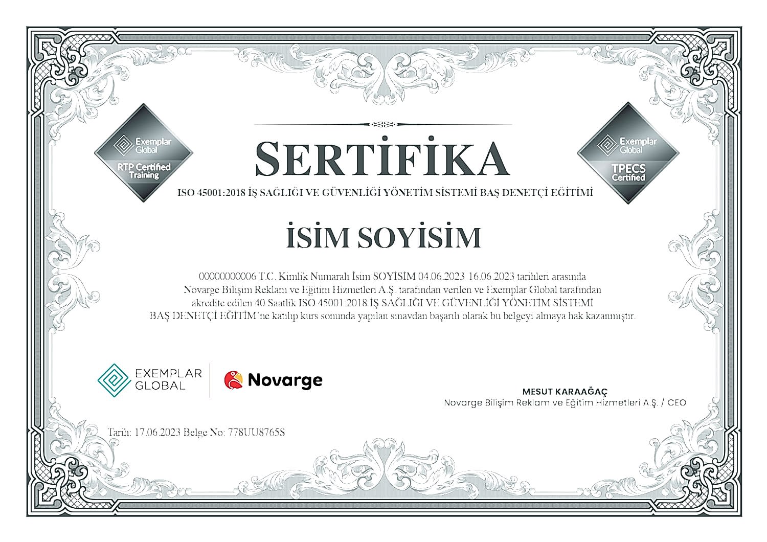 - Exemplar Global onaylı sertifikalar ülkemizde Türkak tarafından geçerliliğe sahiptir